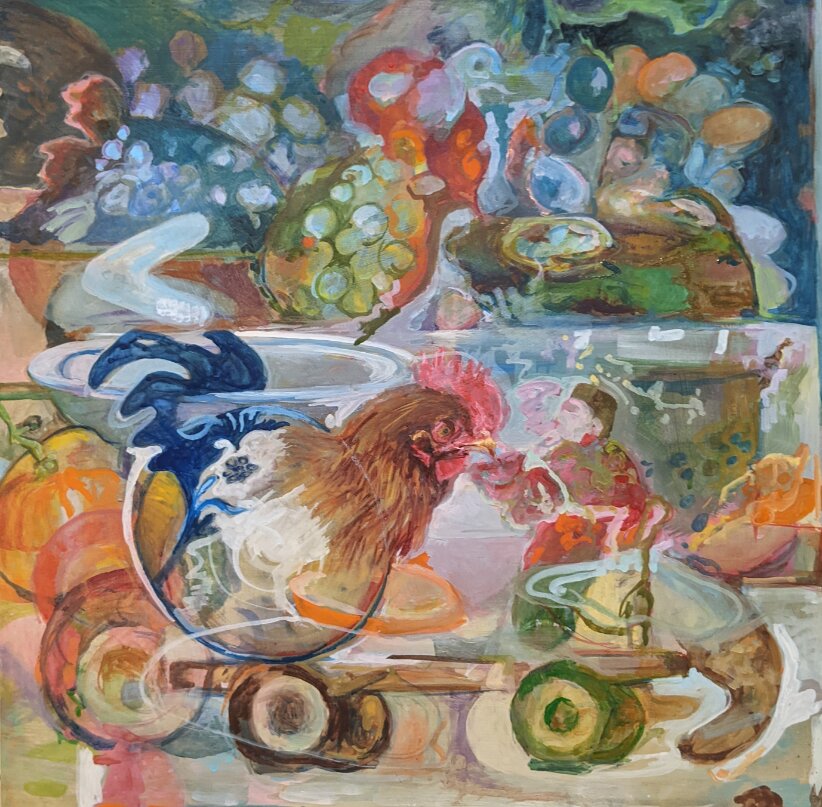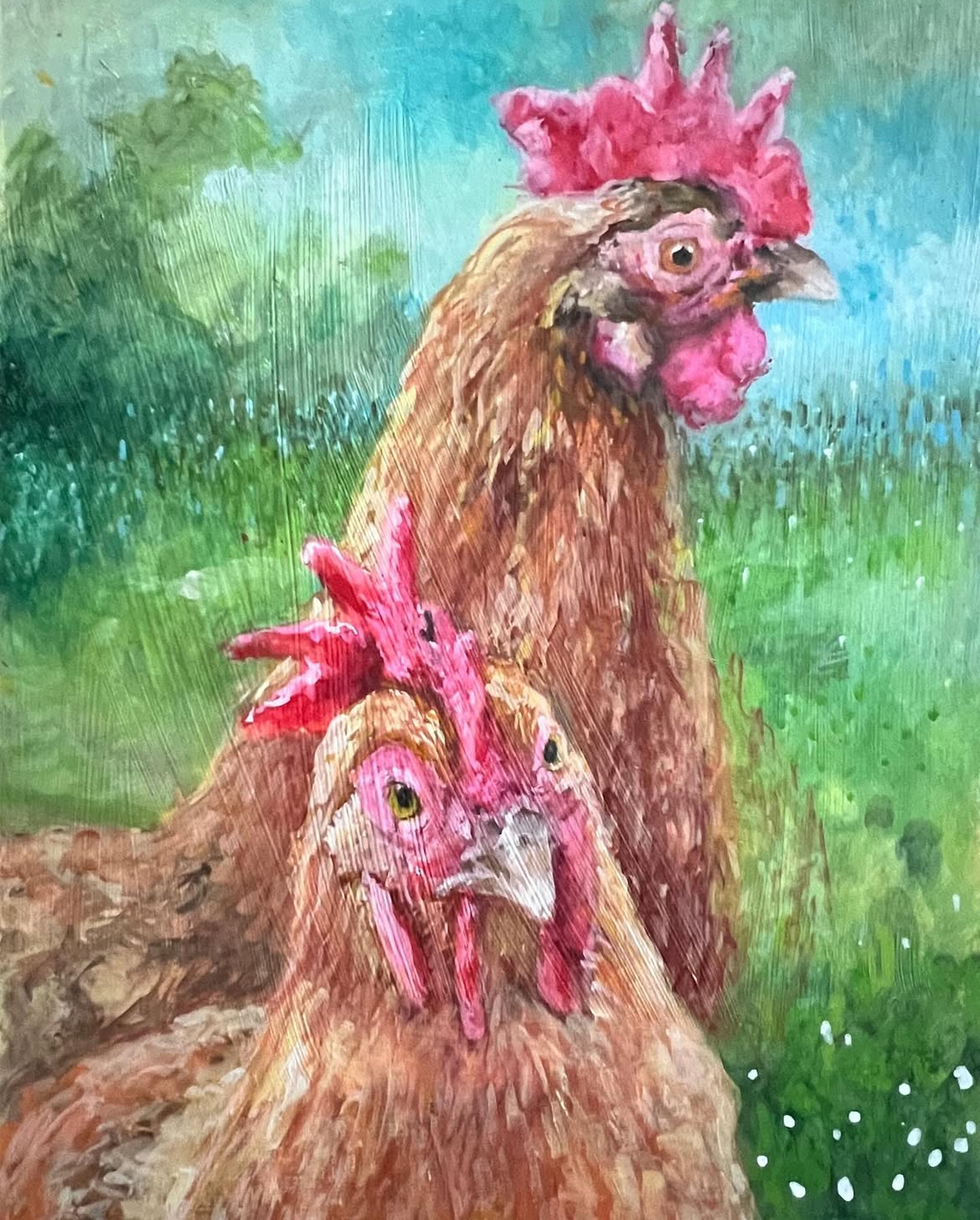 Chickens 12″ x 16″ gouache on wood